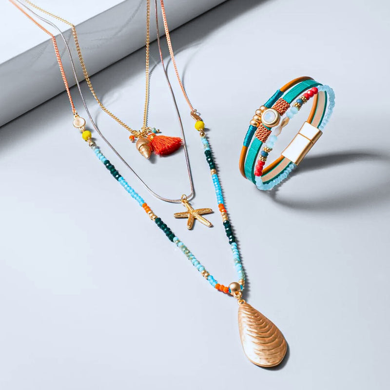 Color Palette: The necklace showcases a striking combination of golden-colored charms and beads, beautifully contrasted with turquoise-colored beads and chain.