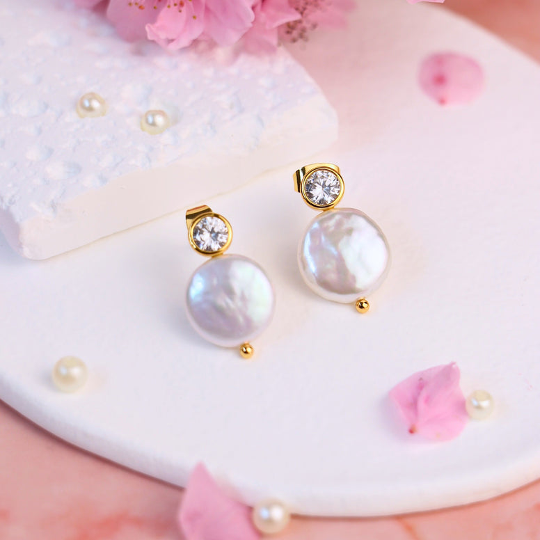 Zircon Mother of Pearl gold stud earrings with baroque freshwater pearl and cubic zircon accents