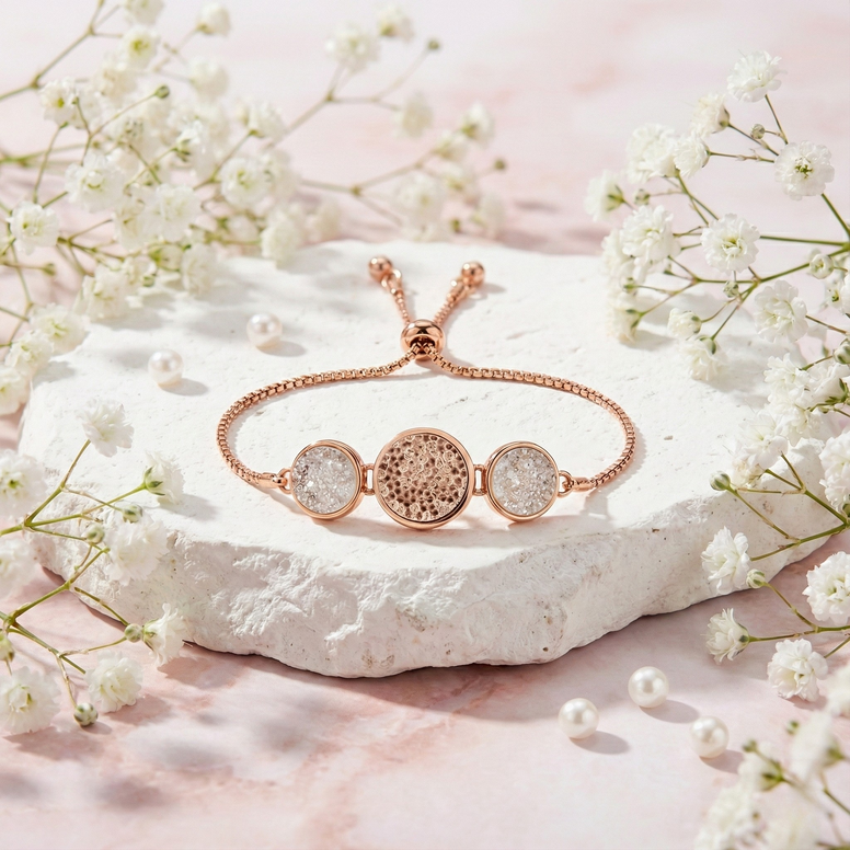 Delicate and versatile, the White Sandy Bracelet features a sliding lock design for a custom fit. Its rose gold finish adds a soft, romantic glow, while the dual circle accents—1cm and 1.5cm in diameter—bring a subtle touch of modern elegance. Perfect for layering or wearing solo, this piece adapts effortlessly to any style.